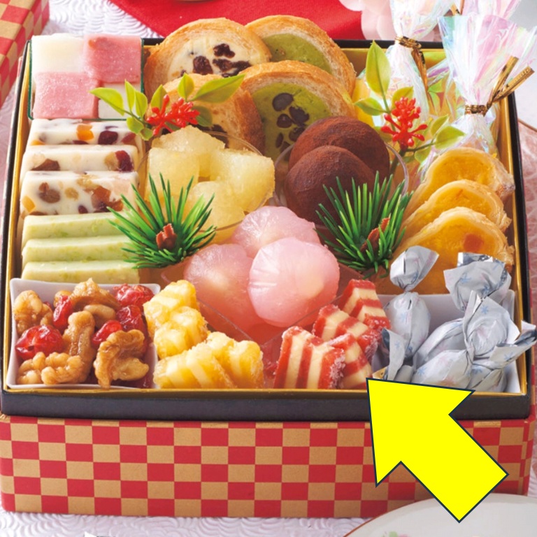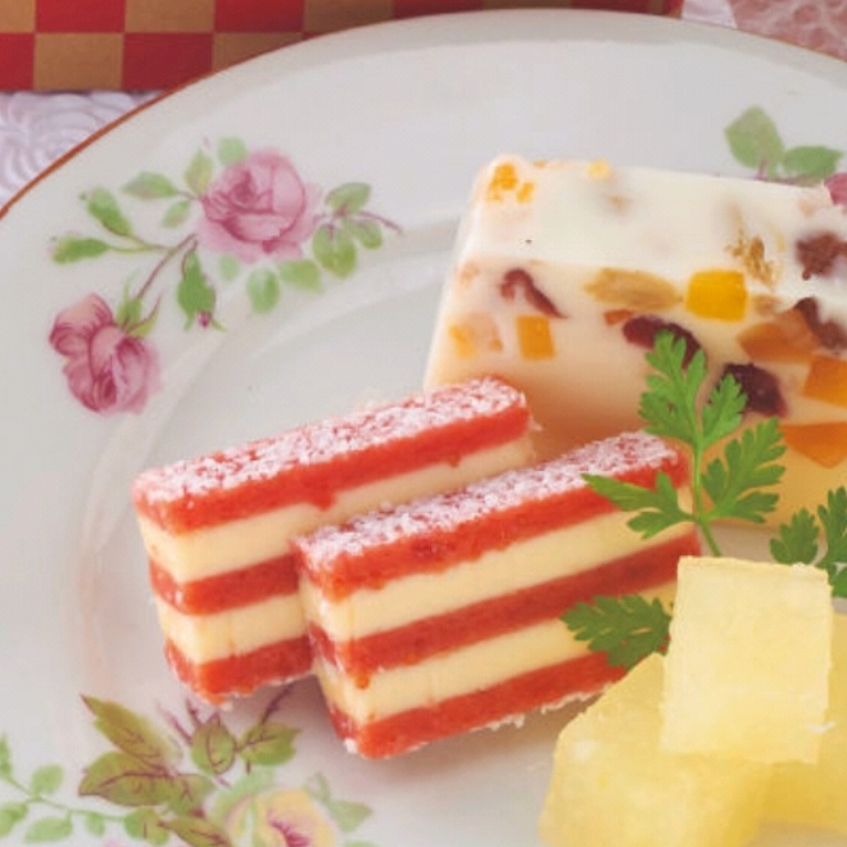 いちごの風味が嬉しい、断面の模様が美しい板状の切り出し物です。