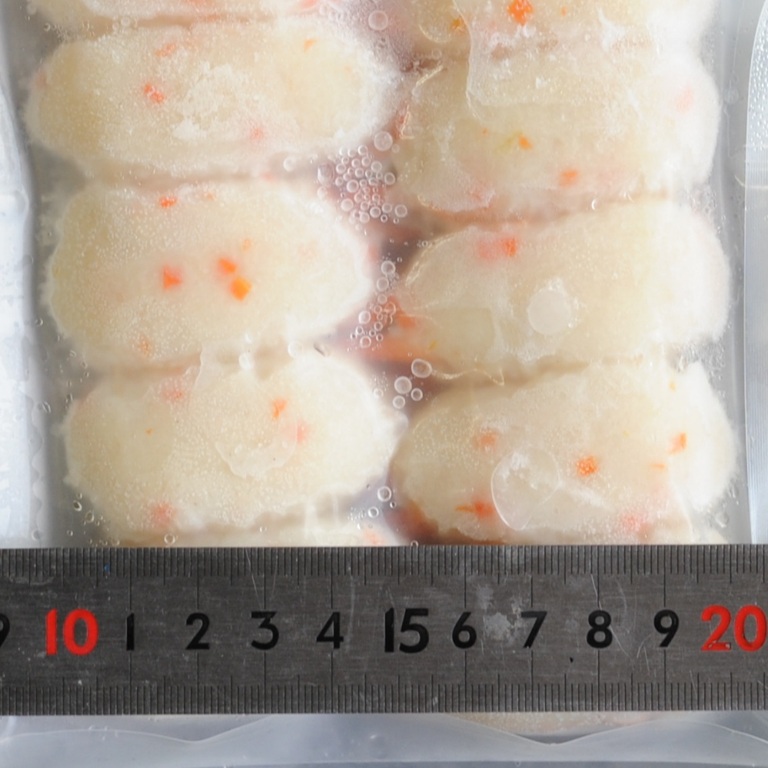 魚肉すり身(いとより、砂糖)、カニ肉、人参、たまねぎ、小麦でん粉、食塩、砂糖、大豆油、卵白粉、カニエキス、(一部に小麦・卵・えび・かに・大豆を含む)