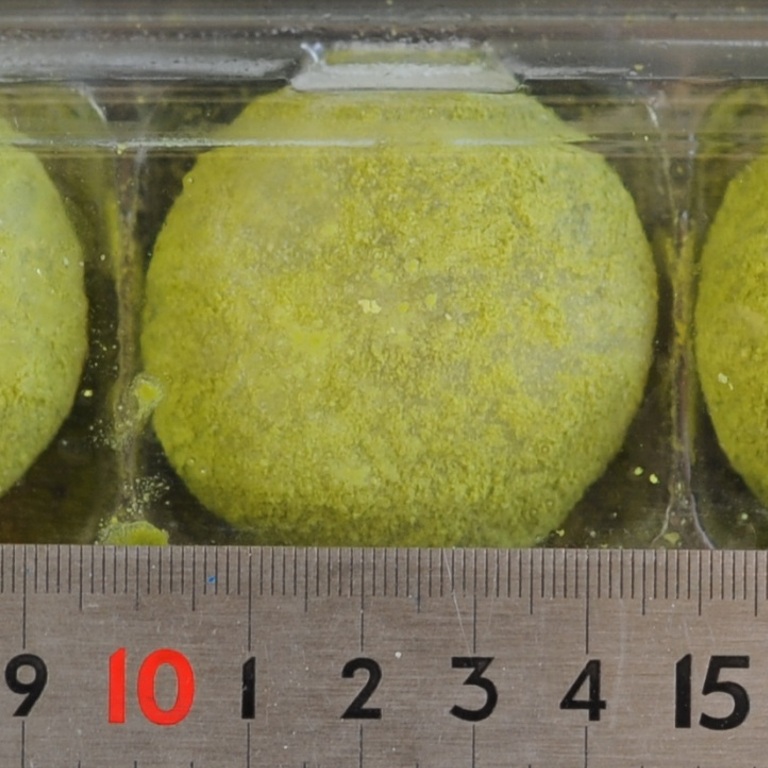 大福生地の中に柔らかいホイップクリーム、こし餡を包み三重層に仕上げ、抹茶粉を塗しました。
