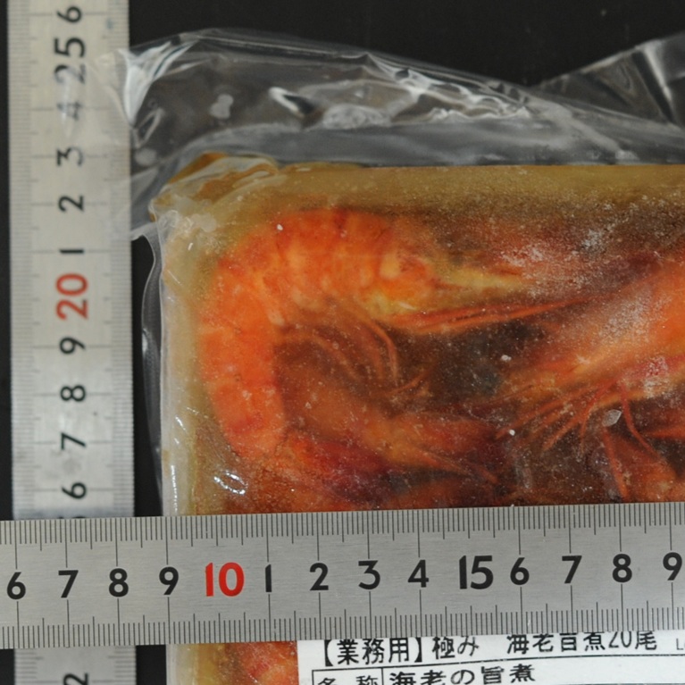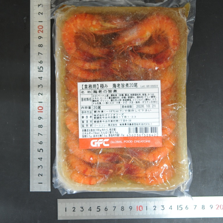 えび(スリランカ産)、調味液(砂糖、醤油、発酵調味料、食塩、かつおエキス、ロースト醤油調味料)、砂糖、(一部にえび・小麦・さば・大豆・豚肉・ゼラチンを含む)