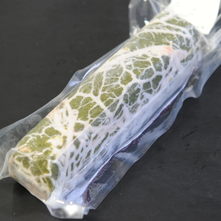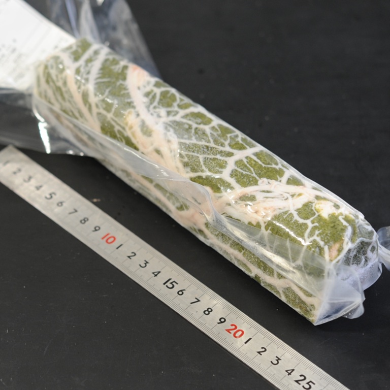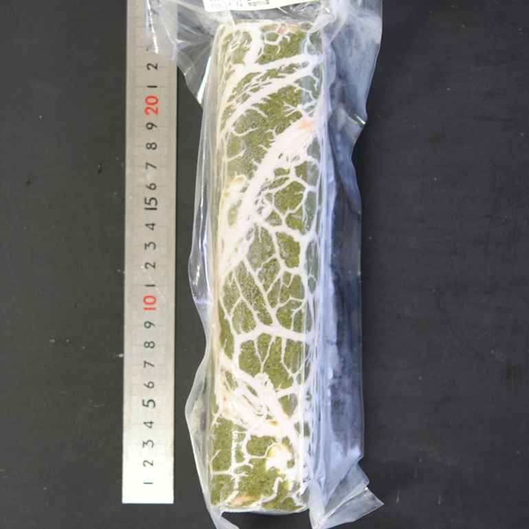 豚肉の練肉に枝豆と赤ピーマンを加え、ほうれん草入りの鶏練肉と網脂で巻いてあります。