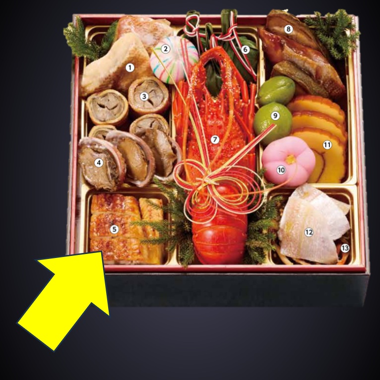 うなぎ蒲焼き(うなぎ(中国)、蒲焼のたれ(しょうゆ、ぶどう糖加糖液糖、砂糖、発酵調味料))、魚肉すり身(魚肉(いとよりだい)、砂糖、食塩、発酵調味料、還元水あめ、魚介エキス)、鶏卵、油脂加工品(植物油脂、食塩、乾燥卵白、乳たん白加工品)、にんじん、木耳、枝豆、みりん風調味料、白だし、食塩