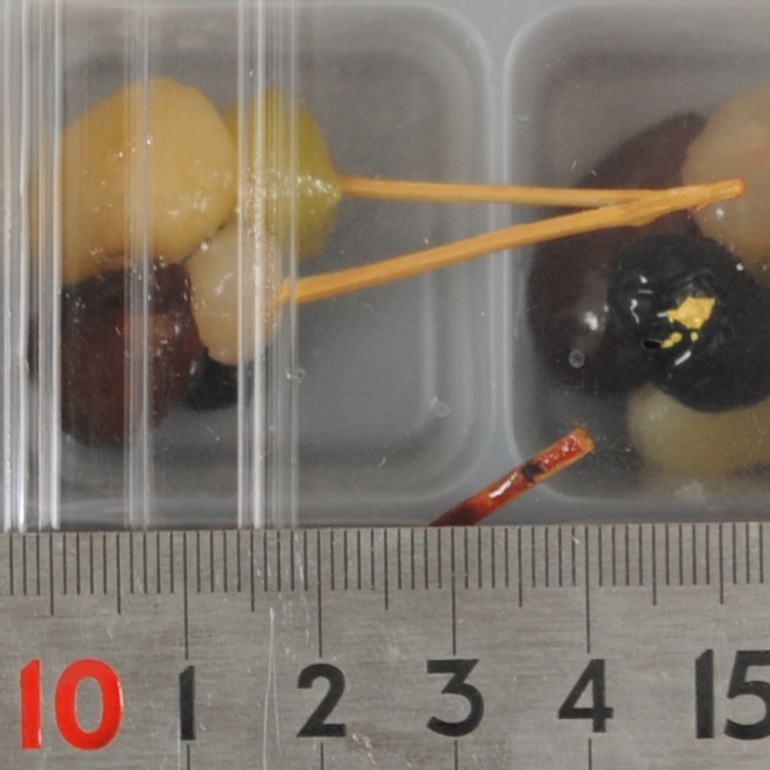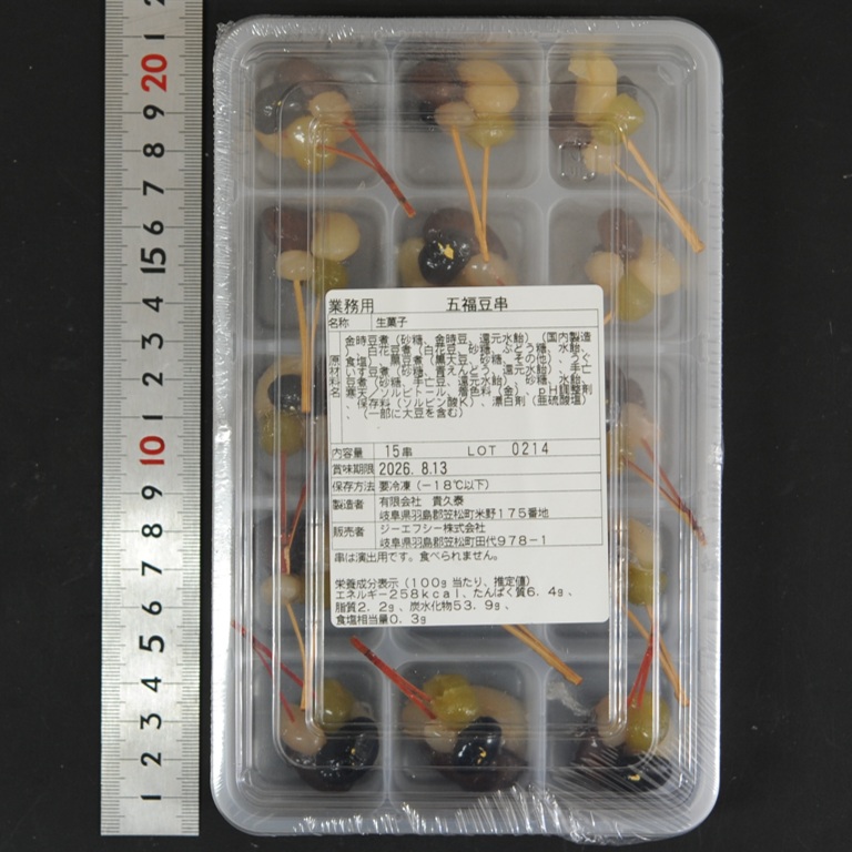 金時豆煮(砂糖、金時豆、還元水飴)(国内製造)、白花豆煮(白花豆、砂糖、ぶどう糖、水飴、食塩)、黒豆煮(黒大豆、砂糖、その他)、うぐいす豆煮(砂糖、青えんどう、還元水飴)、手亡豆煮(砂糖、手亡豆、還元水飴)、砂糖、水飴、寒天