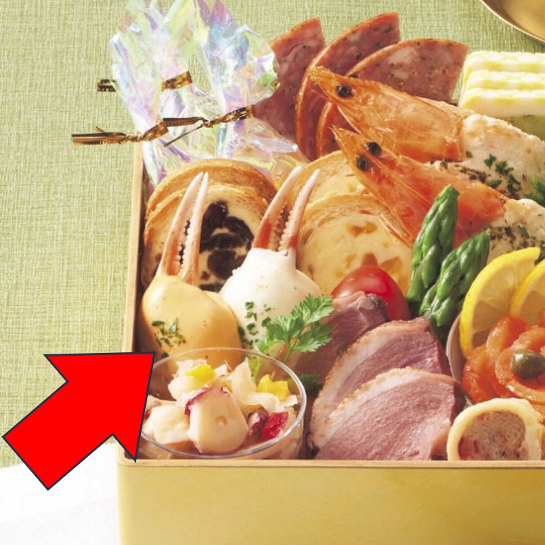 魚肉(ベニズワイガニ(日本)、スケソウダラ(北海道)、ナガツカ)、食用植物油脂、半固体状ドレッシング、牛乳、乳等を主要原料とする食品、砂糖、鶏卵、ゼラチン、大豆たん白、食塩、醸造調味料、しょうゆ、こんぶ調味エキス、カニエキス調味料、乾燥パセリ/増粘剤(加工デンプン、増粘多糖類)酢酸Na、グリシン、調味料(アミノ酸等)、乳化剤、香辛料抽出物、香料、カゼインNa、メタリン酸Na、安定剤(増粘多糖類)、(一部にかに・卵・乳成分・りんご・ゼラチンを含む)