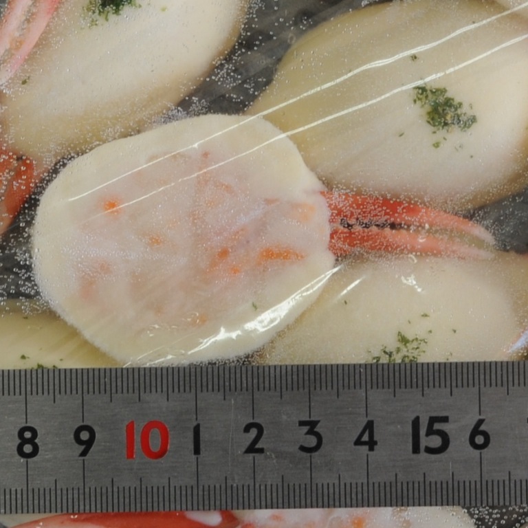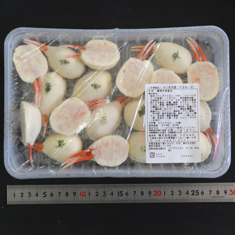 カニ爪に蟹身入りのすり身をつけ、マヨネーズ入り冷製ソースをつけた見た目もきれいな商品です。