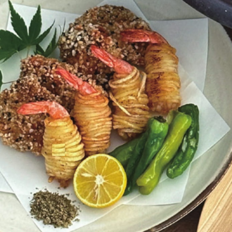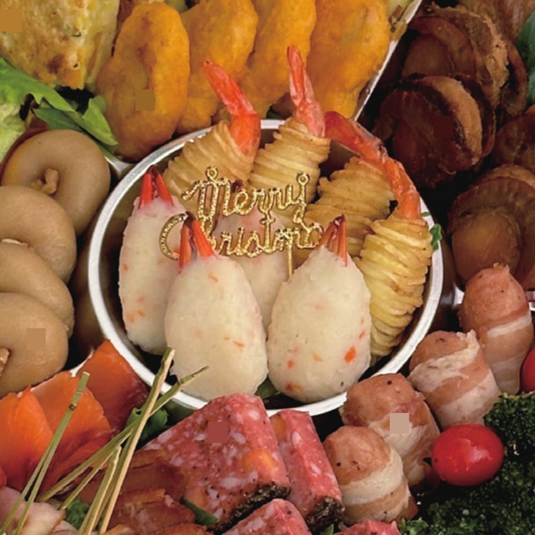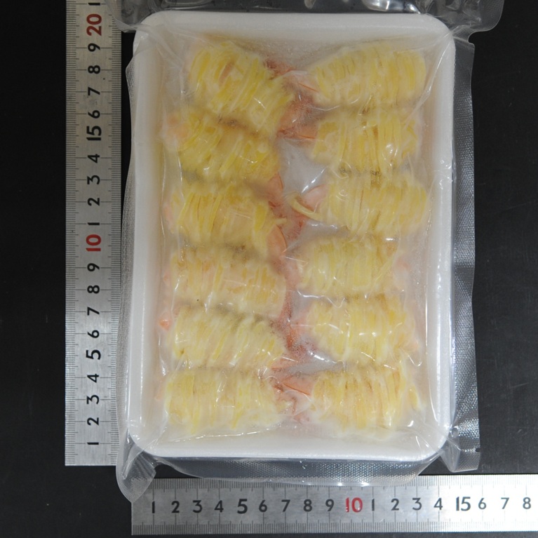 じゃがいも、魚すり身(魚肉、砂糖、卵白粉(卵を含む))、えび、砂糖、じゃがいも澱粉、食塩、胡椒、ニンニク、小麦粉、玉ねぎ、大豆タンパク、パーム油