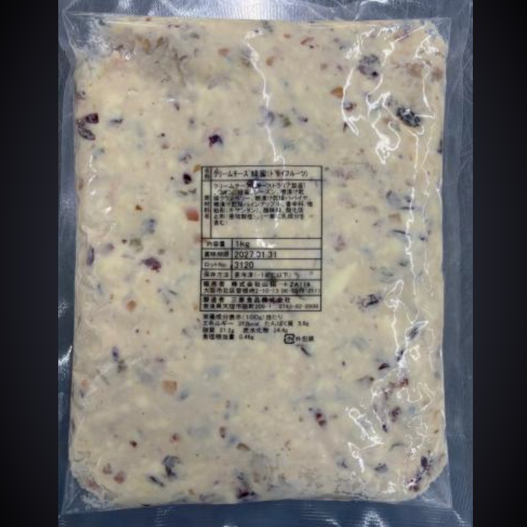 クリームチーズ(オーストラリア製造)、ワイン、蜂蜜、レーズン、糖漬け乾燥クランベリー、糖漬け乾燥パパイヤ、糖漬け乾燥パインアップル、香辛料/増粘剤(キサンタン)、酸味料、酸化防止剤(亜硫酸塩)、(一部に乳成分を含む)