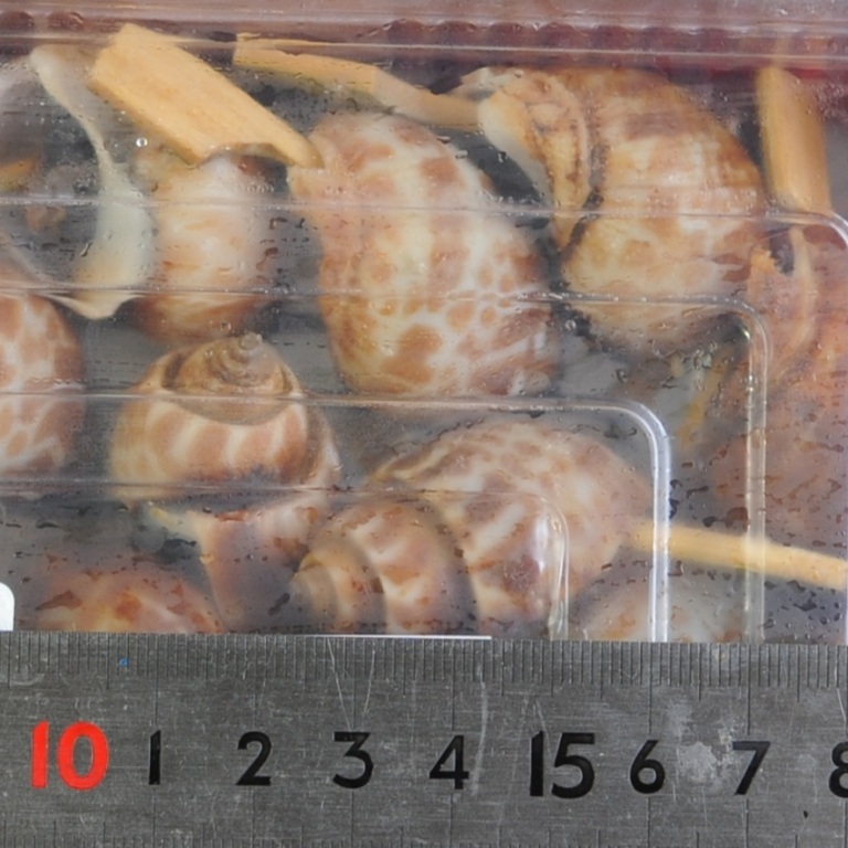 味付したバイ貝を、1粒ずつ串をつけて食べやすくしました。