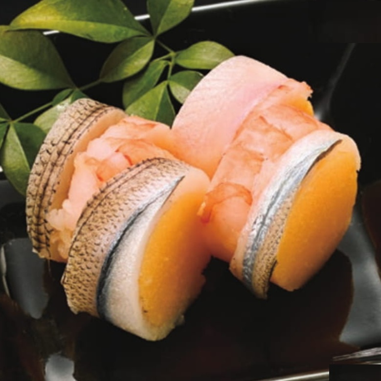 ほど良い酸味と甘味のあるしっとりやわらかな、黄身寿司の上にえび(紅)とさより(白)を交互に巻き付けた、手綱(絆)を印象付ける、おめでたい席にピッタリな一品です。