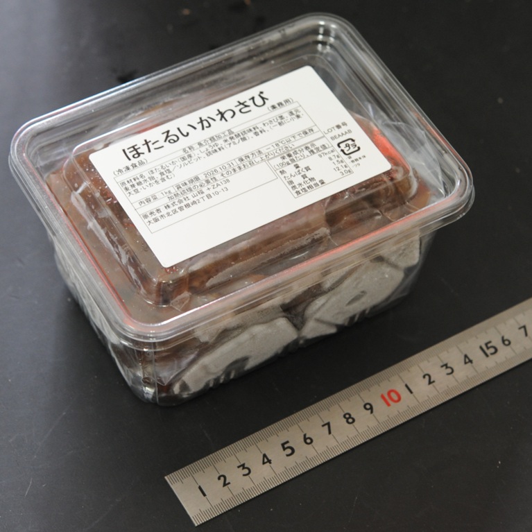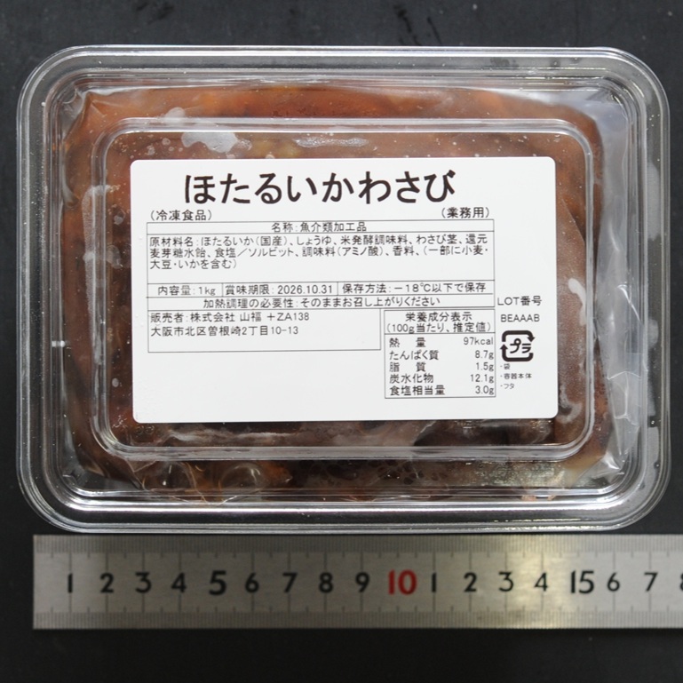 ほたるいか(国産)、しょうゆ、米発酵調味料、わさび茎、還元麦芽糖水飴、食塩/ソルビット、調味料(アミノ酸)、香料、(一部に小麦・大豆・いかを含む)