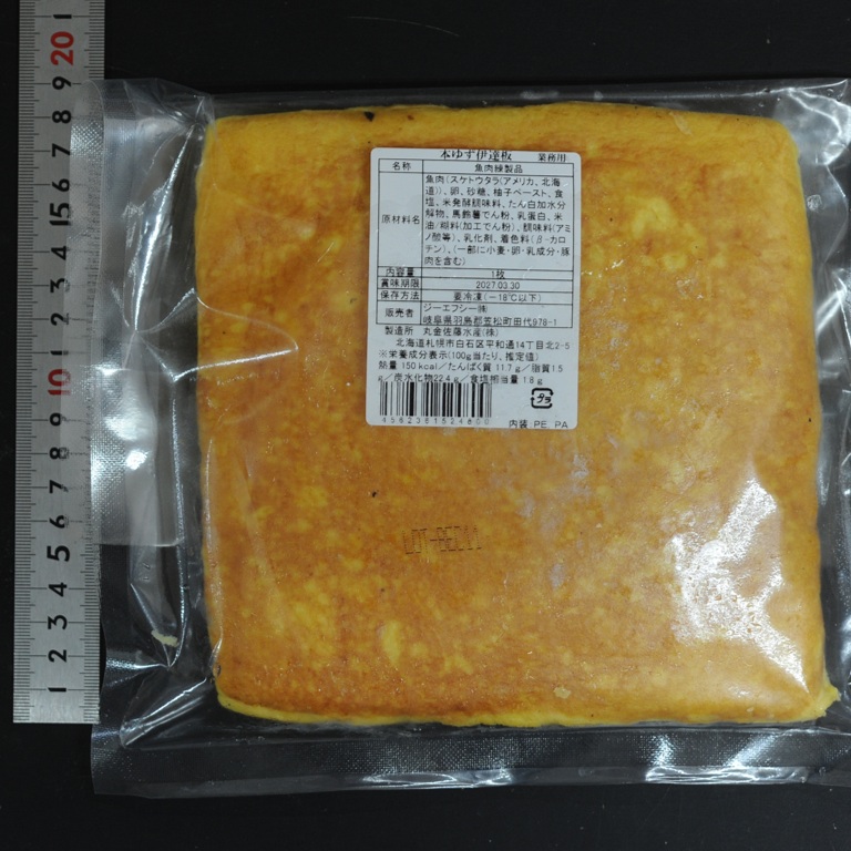 魚肉(スケトウタラ(アメリカ産、北海道産))(49.6%)、卵(19.9%)、砂糖(14.9%)、柚子ペースト(4.5%)、食塩(1.6%)、米発酵調味料(1.5%)、動物たん白加水分解物(0.88%)、馬齢薯でん粉(0.8%)、乳蛋白(0.44%)、米油(微量)