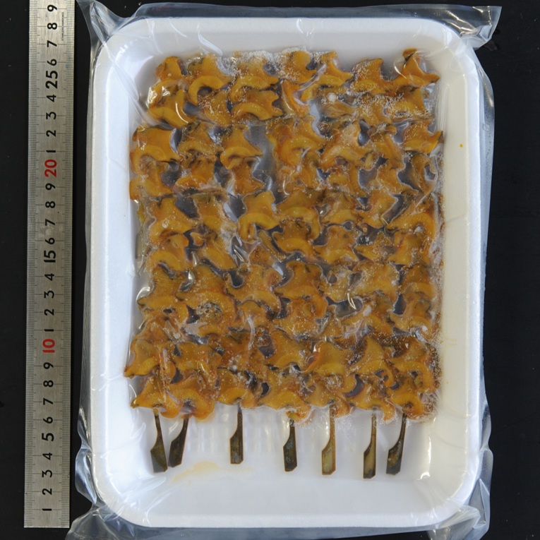 甘辛く味付けしたあかにし貝を食べやすい大きさにカットして、串刺ししています。
