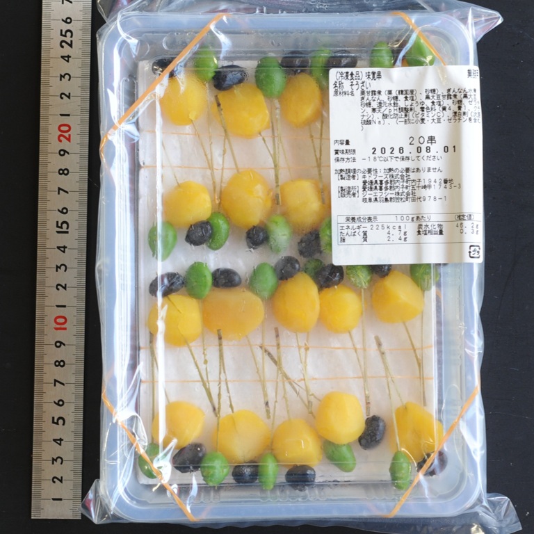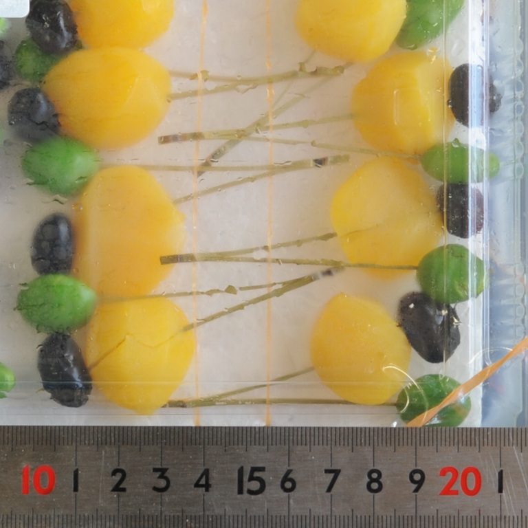 栗甘露煮(栗(韓国産)、砂糖)、ぎんなん水煮(ぎんなん、砂糖、食塩)、黒大豆甘露煮(黒大豆、砂糖、還元水飴、しょうゆ、食塩)、砂糖、ゼラチン、寒天/pH調整剤、着色料(黄4、青1、クチナシ)、酸化防止剤(ビタミンC)、漂白剤(次亜硫酸Na)、(一部に小麦・大豆・ゼラチンを含む)