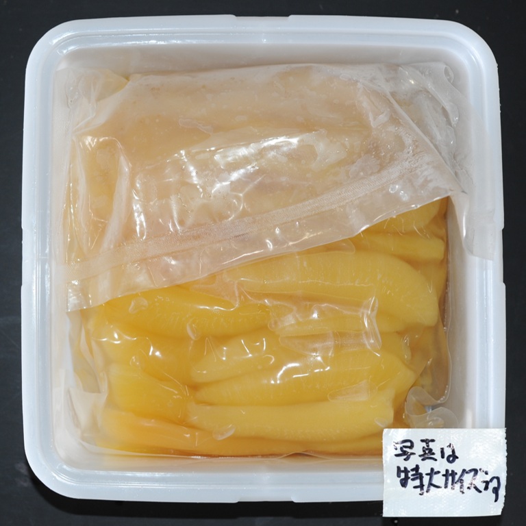 子持ち昆布・数の子は解凍直後、卵の中の水分(調味液)を吐きだした状態になり卵が萎んでしまい目減りします。食感も悪く本来のプチプチとした歯ざわりの良い状態ではありません。その後、数時間かけて吐きだした水分(調味液)を再吸収し本来の卵の張りに戻ります(解凍直後の目減り分が戻ります)。