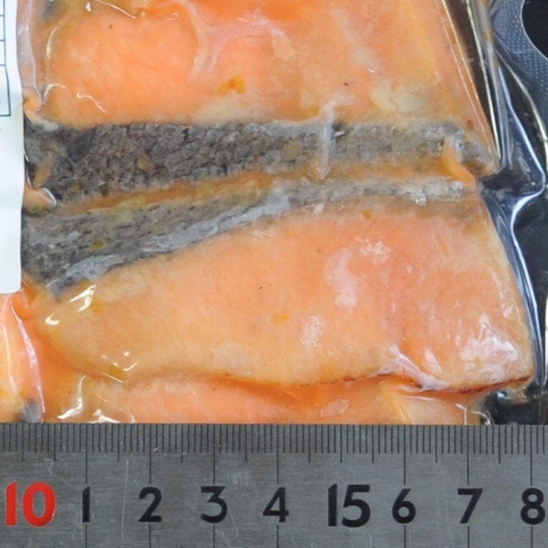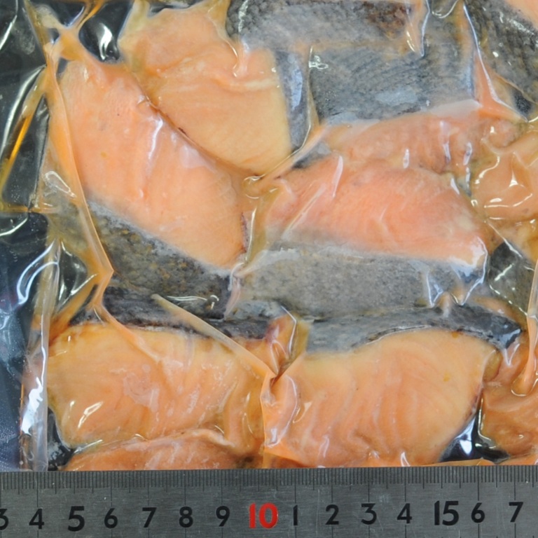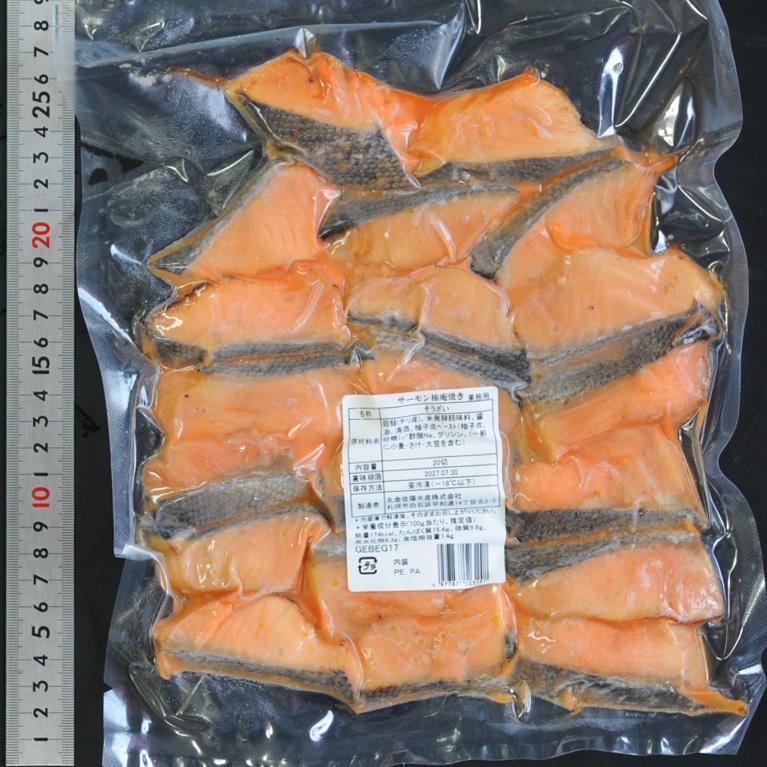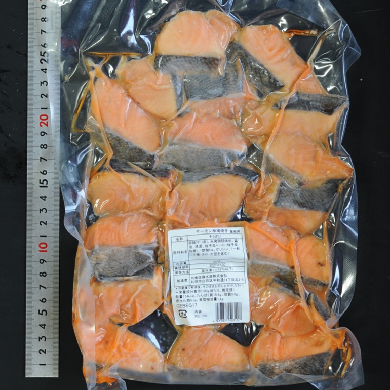 アトランティックサーモン(チリ産)、米発酵調味料、醤油、清酒、柚子皮ペースト(柚子皮、砂糖)/酢酸Na、グリシン、(一部に小麦・さけ・大豆を含む)