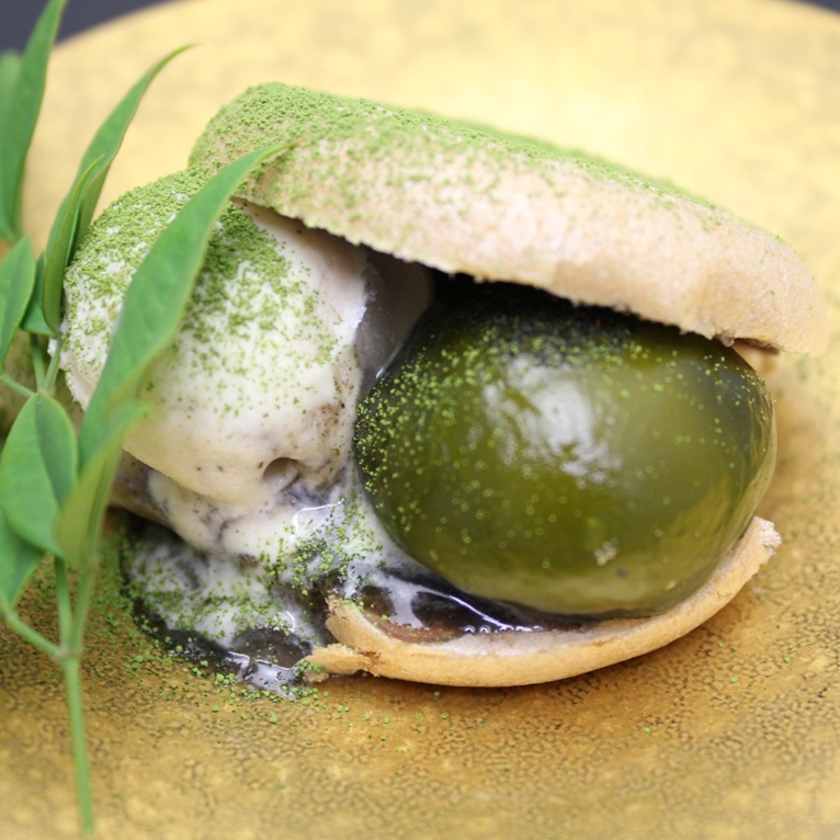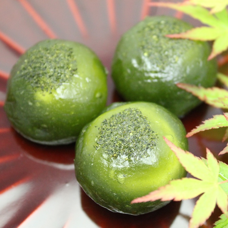 沖縄県産の塩(屋我地島の塩)とホイップクリーム、自家製白ねり餡を混ぜ込んだクリーミーなあんを濃い抹茶の葛餅で包みました。