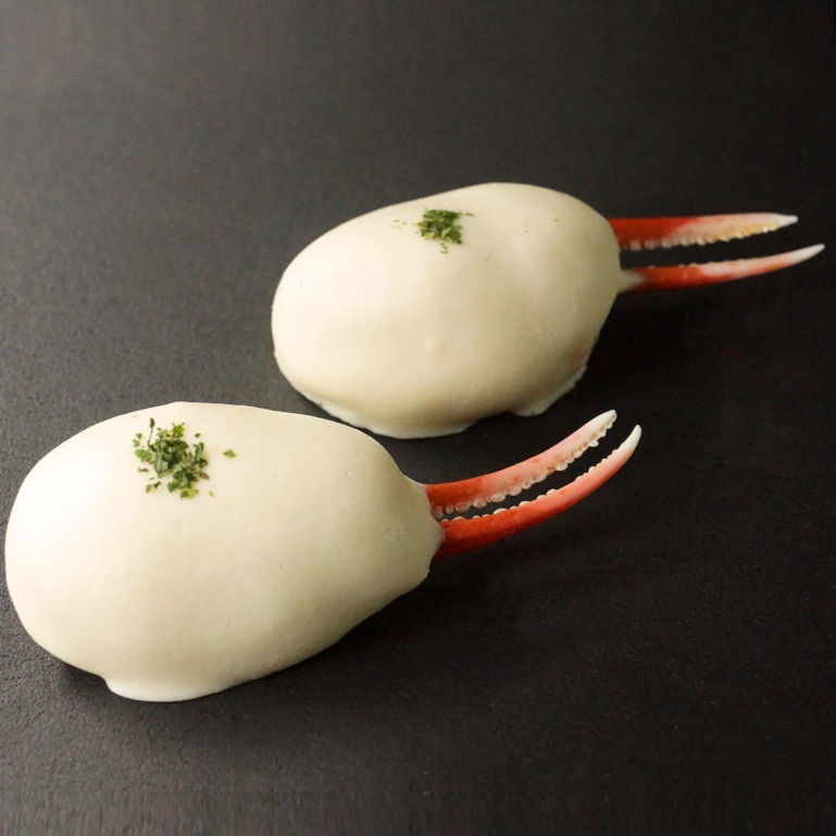 カニ爪に蟹身入りのすり身をつけ、マヨネーズ入り冷製ソースをつけた見た目もきれいな商品です。