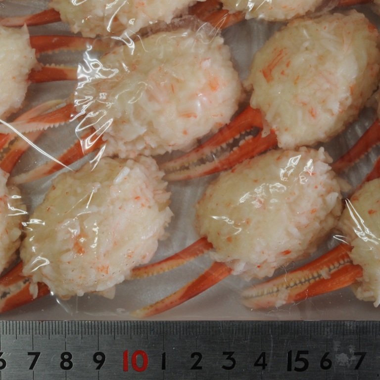 紅ズワイ蟹の爪に北海道産のすけそうだらのすり身をベースに卵、蟹エキスなどを入れた生地で包み、外側にカニカマの微塵切りをつけた彩り綺麗な一品です。