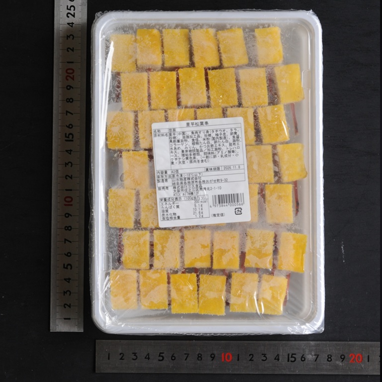 里芋 (中国)、魚肉すり身(タチウオ、タラ、砂糖)、油脂加工品、砂糖、柚子皮、卵黄、馬鈴薯澱粉、食塩、米粉(国内製造)、魚醬、コラーゲン、植物たん白、卵たん白、澱粉、水あめ、みりん、かつお節エキス、昆布工キス、麦芽糖調製品/加工澱粉、トレハロース、増粘多糖類、調味料(アミノ酸等)、クチナシ黄色素、(一部に卵・乳成分・小麦・大豆·豚肉を含む)
